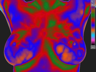 When breast tissue abnormalities exits blood flow can be altered to that area. In most, but not all cases, abnormalities are associated with increased blood flow. As a result, skin temperature in the involved areas increases compared to surrounding normal tissues. Breast thermography is able to detect those temperature changes. Additionally, if there are newly formed or engorged blood vessels, Thermography can detect those changes as well.